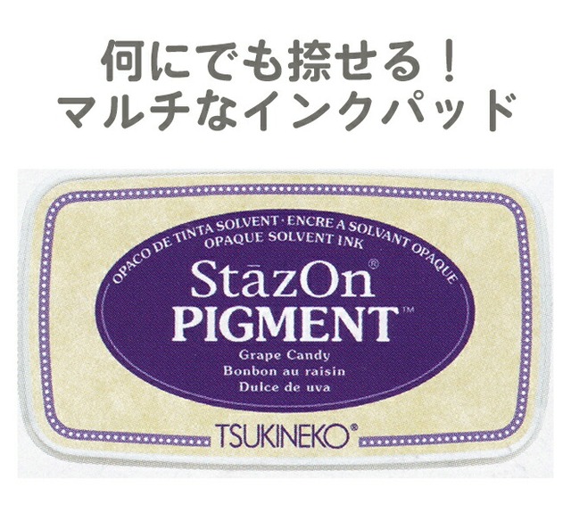 ステイズオン ピグメント ツキネコ 顔料系インク StazOn PIGMENT Grape Candy グレープキャンディ SZ-PIG-011 ステイズオンシリーズの最新作!不透明タイプのインク台 便利すぎるオールマイティインクパッド! プラスチック 金属 ゴム 皮革 コート紙 普通紙 写真 ガラス 布…あらゆる材質に使用できるオールマイティインクパッド。ガラス、ビニール、金属にもにも適した不透明な仕上がり。すぐに使用できるインク含浸タイプで、手間なく便利です。 ※滑りやすい素材でのご使用はご注意ください。非吸着面でしたら、失敗してもステイズオンクリーナーで落とすことができます。※使用後のスタンプは、早めにステイズオンクリーナーでインクを落とし、最後に水拭きしてください。※樹脂製のクリアスタンプは、印面の材質により変質する場合がありますので、事前にテストすることをおすすめします。※吸着する素材では、不透明にならない場合があります。※乾燥を防ぐために、使用後すぐに蓋をしてください。※パッドのインクが乾燥して硬くなったら、ステイズオンソルベントを少量ずつ垂らして数分なじませてください。 【在庫がある場合】1営業