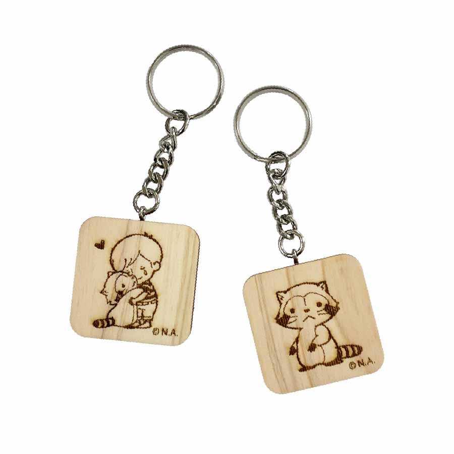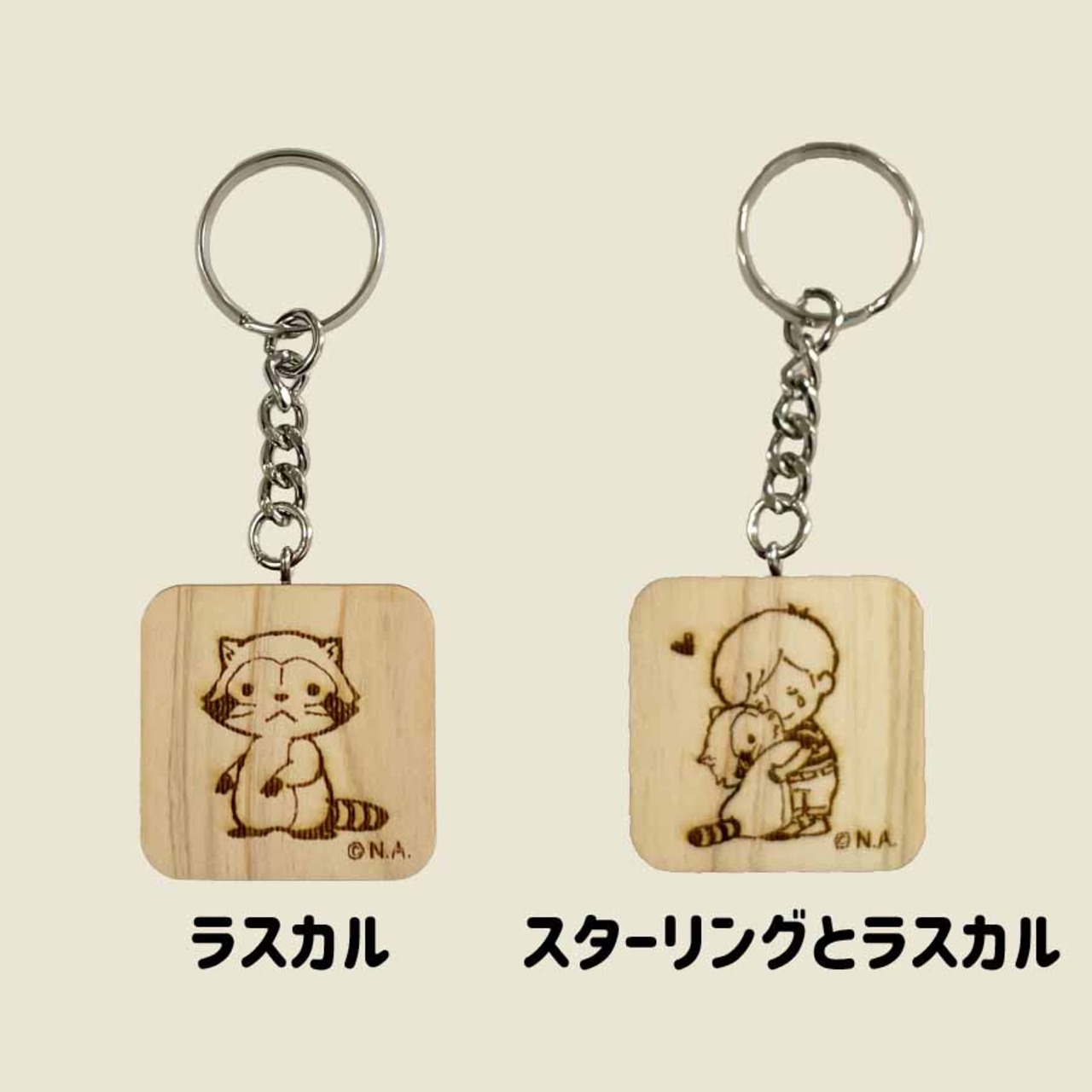 ラスカルやスターリングのイラストを木製キーホルダーにレーザー刻印しました。