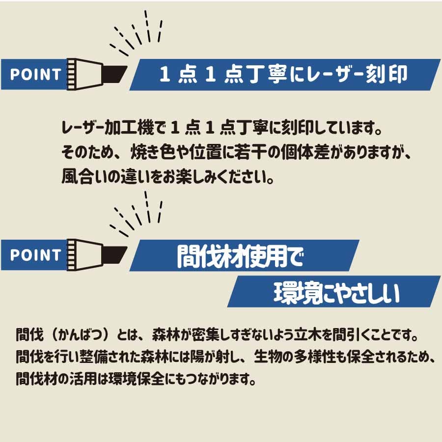 印刷ではなくレーザー刻印のため、木材の硬さ等により濃淡に個体差があります。独特の風合いをお楽しみください。