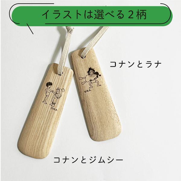 間伐材で作られた靴べらに、コナンやラナ、ジムシーのイラストをレーザー刻印しました。間伐(かんばつ)とは、森林が密集しすぎないよう立木を間引くことです。間伐を行い整備された森林には陽が射し、生物の多様性も保全されるため、間伐材の活用は環境保全にもつながります。レーザー加工機で1点1点刻印しているため、木目の状態、刻印の焼き色や位置に若干の個体差がありますが、風合いの違いをお楽しみください。コナンとラナ コナンとジムシーの2柄【生産国】日本【サイズ】横幅最大40mm×縦115m