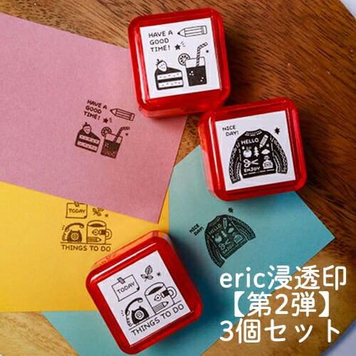 <プラスチック製ケース入り スタンプ台不要のインク付きスタンプです>お送りする柄は「おやつ」「セーター」「THING TO DO」の3柄です。3個セットでお届けします!?消しゴムはんこ作家・イラストレーター[eric]デザイン。?スタンプ台不要のポンポンおせるインク付きスタンプ。?スケジュール帳やノートを可愛らしくデコレーション、手作りカード作成や付箋にもオススメです。?デザインの種類は3種類。 ※捺印カラーは黒色です。?細かい柄や文字も綺麗に捺せます。商品サイズ:W 32xD 32xH 38mm
