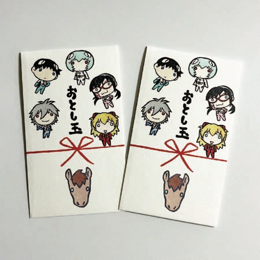 ゆるしとやエヴァンゲリオンパイロットのイラストが可愛いおとし玉袋。2026年の干支である馬と共に消しゴムはんこイラストでデザインしました。