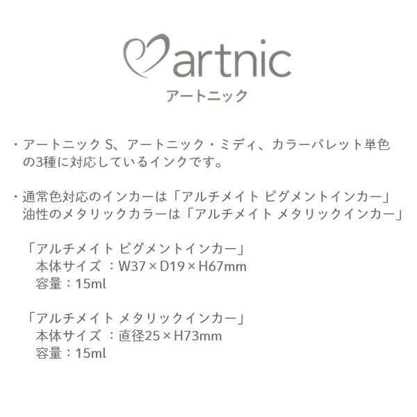 ・「アートニック S」「アートニック・ミディ」「カラーパレット単色」 の3種に対応しているインクです。・通常色対応のインカーは「アルチメイト ピグメントインカー」 油性のメタリックカラーは「アルチメイト メタリックインカー」 「アルチメイト ピグメントインカー」 本体サイズ :W37×D19×H67mm 容量:15ml 「アルチメイト メタリックインカー」 本体サイズ :直径25×H73mm 容量:15ml全96色 豊富なカラーバリエーションで微妙な色彩表現が可能です。